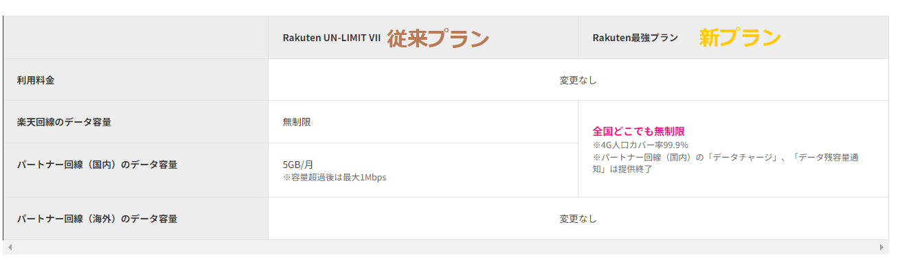 まずは利用料金は「変更なし」、楽天回線のデータ量とパートナー回線のデータ量、ここが変更のあった場所ですね。